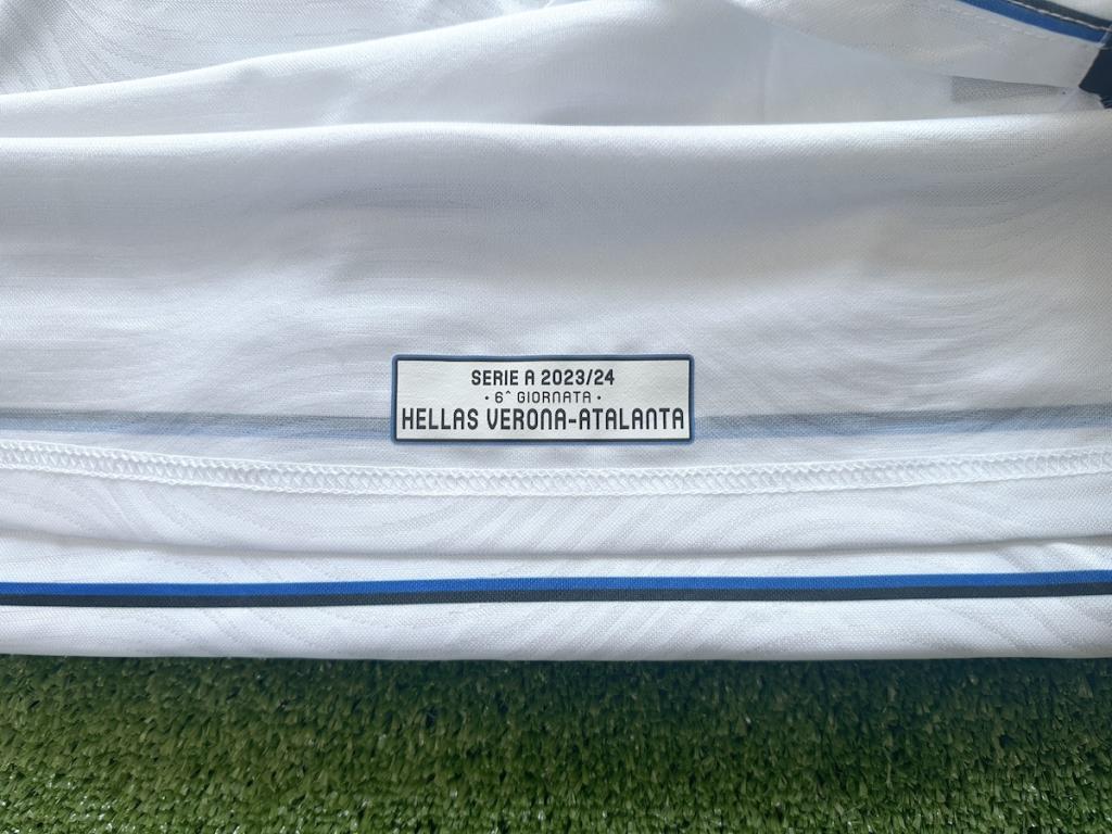 La divisa riporta, come voluto dalla società bergamasca, l'etichetta interna relativa alla partita Hellas Verona - Atalanta, giocata il 27 settembre 2023.